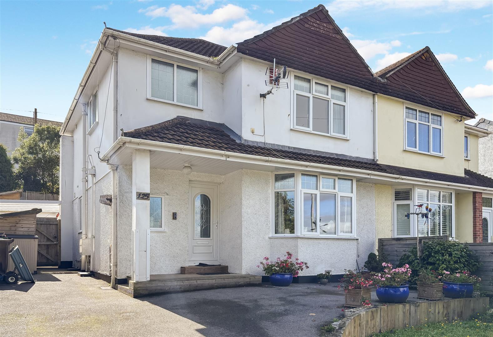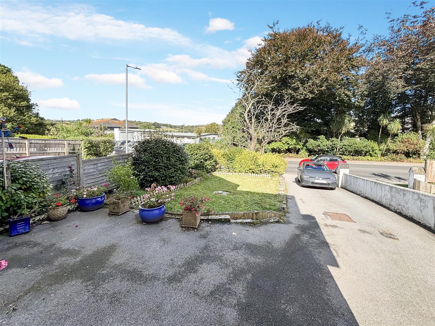 A deep, low maintenance, tarmacadam driveway, providing off-road parking for several vehicles. A small lawned area, bordered by low lying hedging and granite stones, provides a degree of shielding from Dracaena Avenue.
