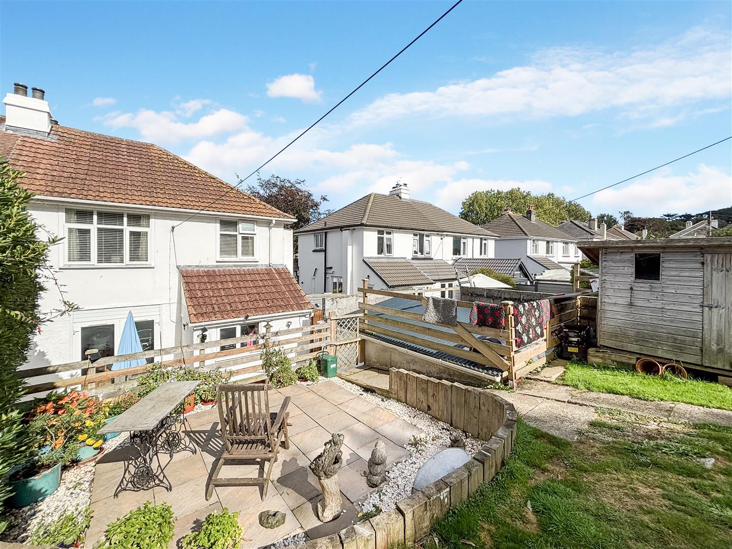 A broad area, paved with mellow stone, and enclosed by retaining walls with immediate access from the dining area, together with side access from the garage. An excellent sheltered area, enclosed and safe, especially for those with children or pets, and a fabulous sun trap in the afternoon. Side access to an enclosed rear passageway, covered by convenient polycarbonate roofing, providing a small enclosure, useful for storage. Steps rise to:-