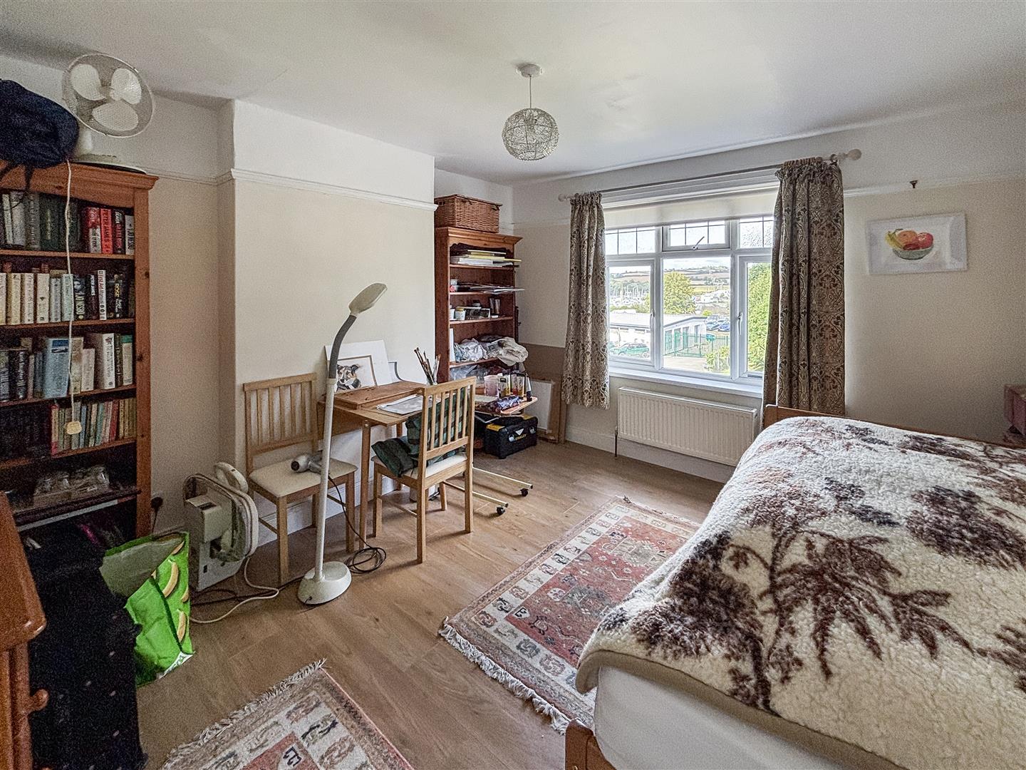 Another similarly proportioned double bedroom, with picture rails, broad glazing providing an elevated overlook over the rear garden. Radiator, ceiling light. Ample space for bedroom furniture.
