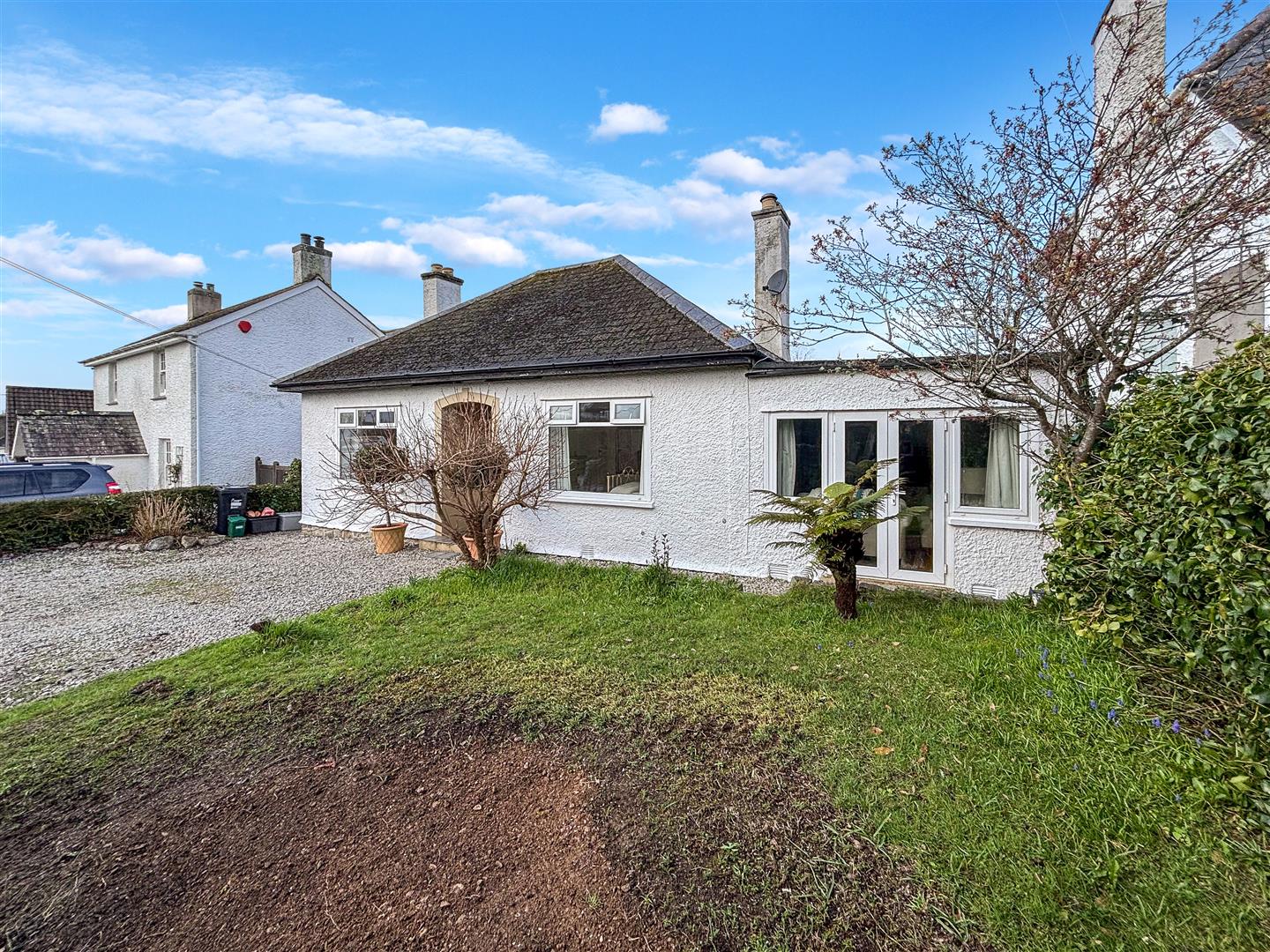 A gravelled driveway providing ease of maintenance and plentiful parking. Adjacent to the driveway is a small lawned frontage surrounded by mature borders, allowing for a degree of privacy. The gravelled pathway continues around the southern elevation of the property, with timber garden gate opening to the rear.