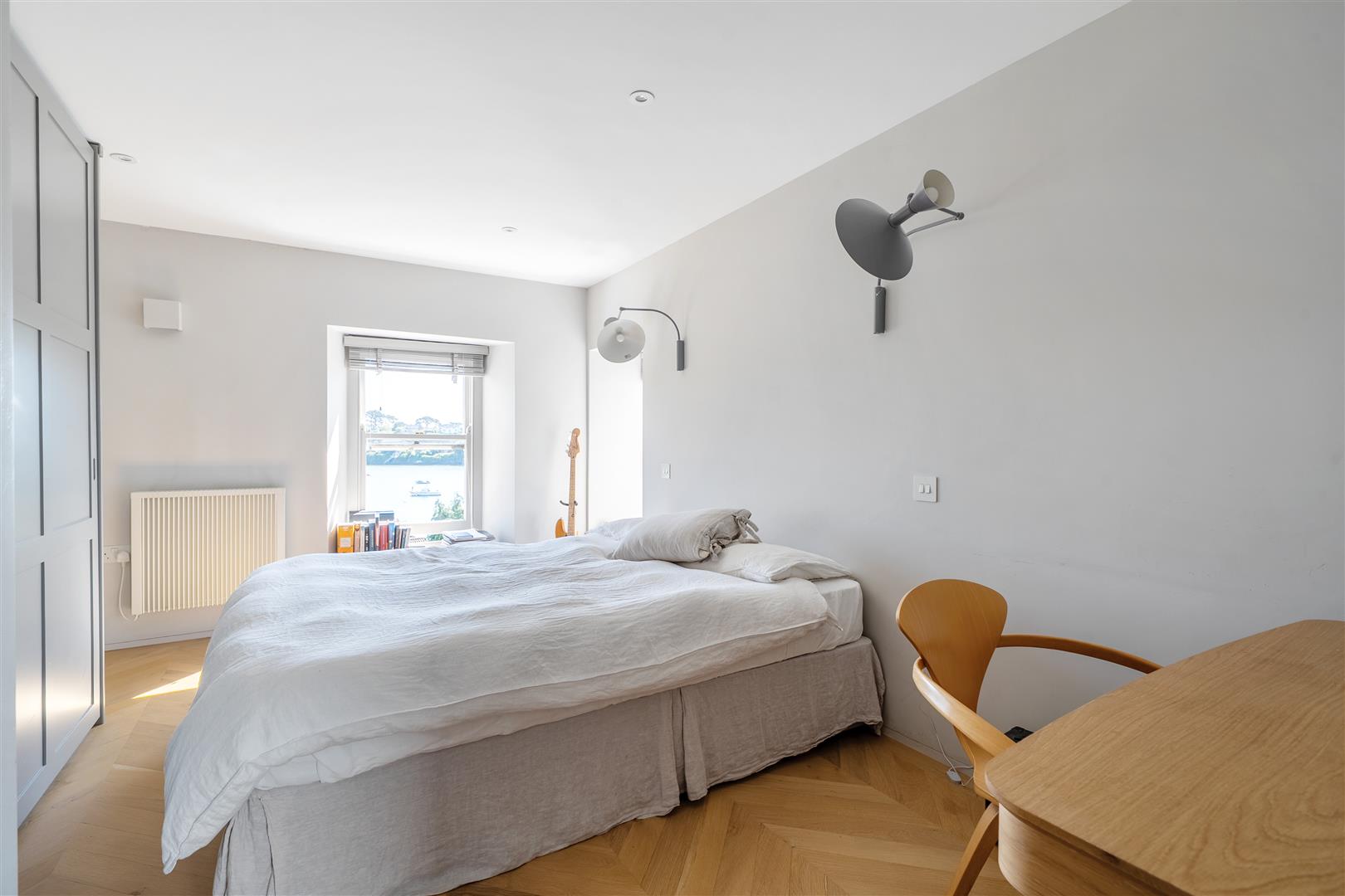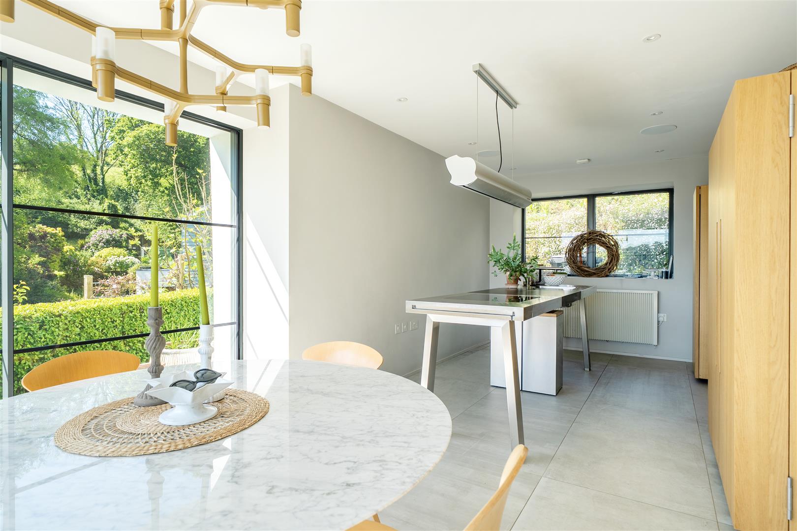 A beautifully light kitchen, contemporary and minimalist in design, incorporating a Bulthaup work bench with cooker and sink. Large freestanding Bulthaup units providing plentiful storage. South east-facing floor-to-ceiling sliding doors, open out to the large sun terrace bringing the outside in, flooding the room with natural light and enjoying an outstanding view over the creek - the perfect set up for entertaining and al fresco dining.