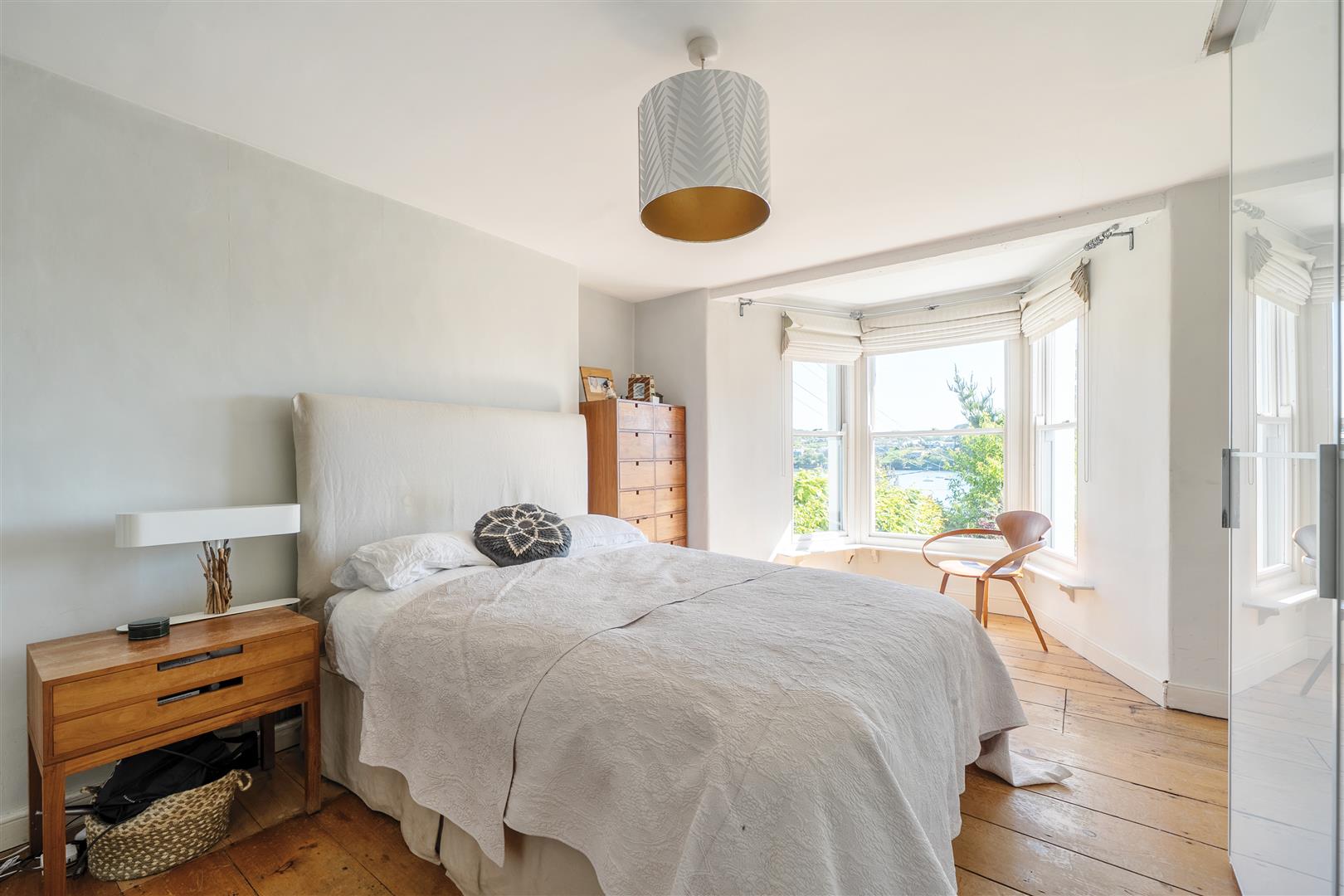 A delightful bedroom, with large bay window enjoying far-reaching views across and down Restronguet Creek. Original broad wood floorboards, floor-to-ceiling wardrobes and stained glass double doors providing access to:-