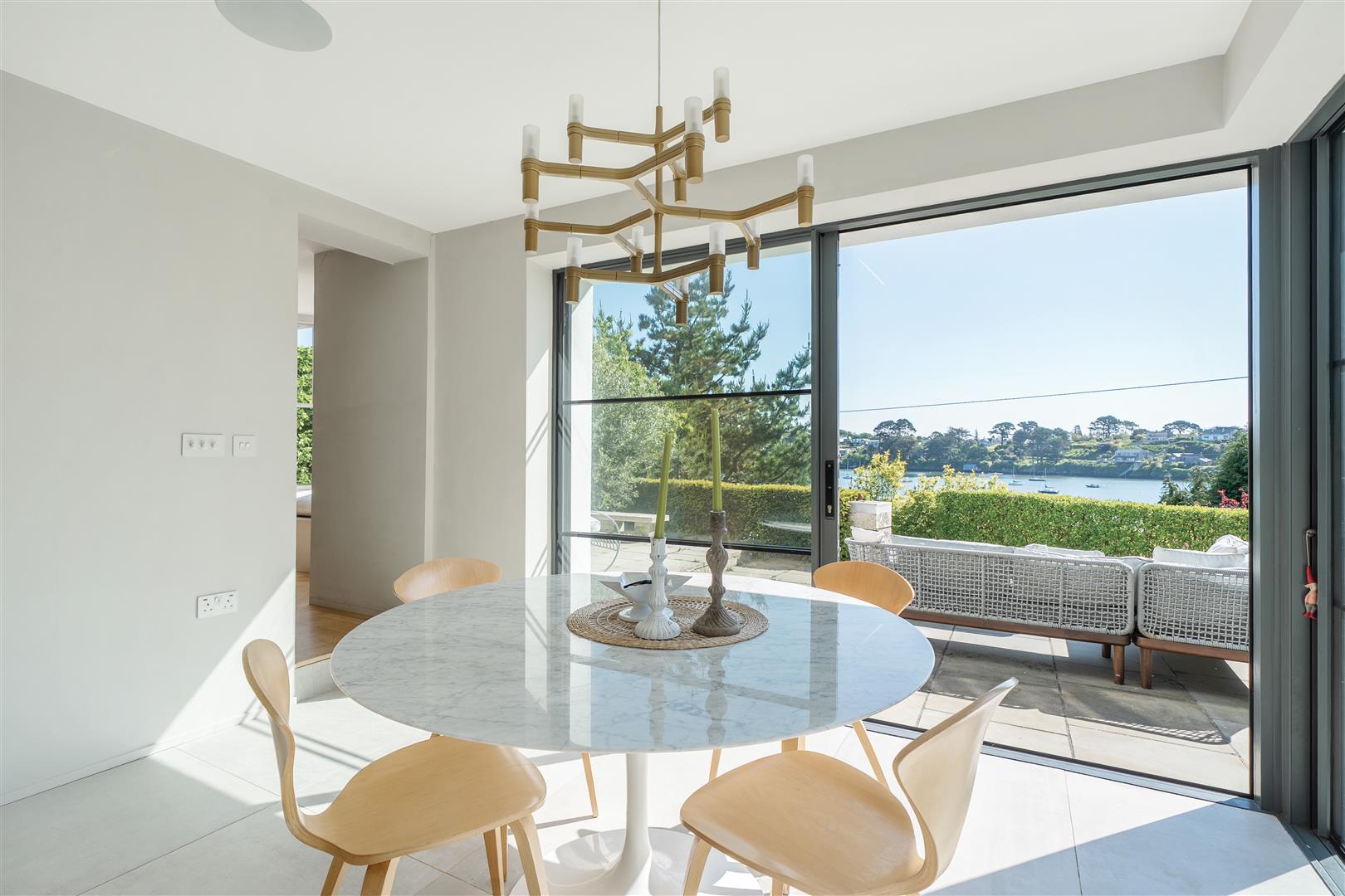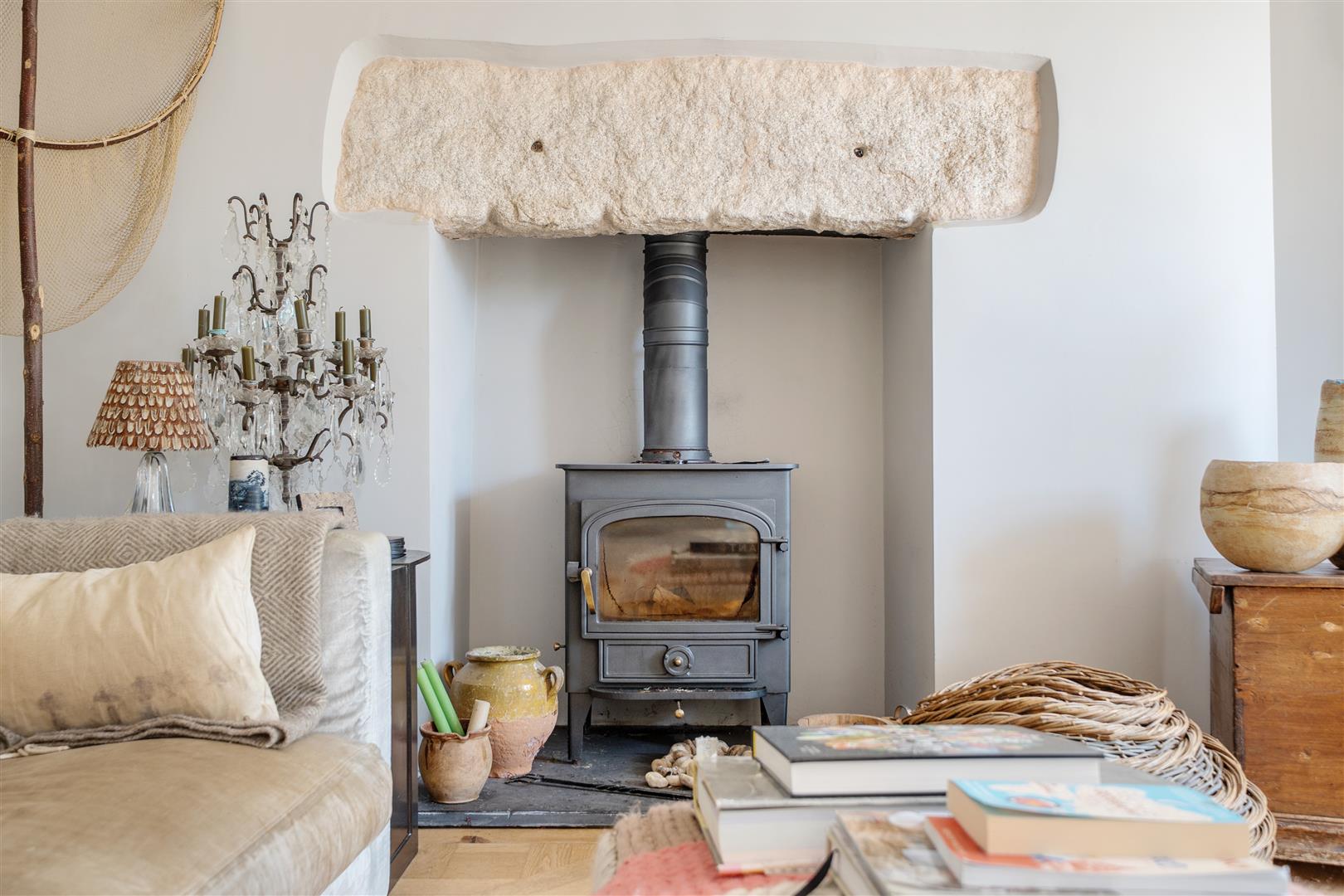 A beautifully light reception room, with two large deep bay windows facing east and overlooking the creek. Central double doors leading onto the paved terrace. A contemporary floating staircase, with glass balustrade rises to the first floor. Fireplace housing cast iron wood-burning stove with granite lintel over, set on a slate hearth. Door to:-