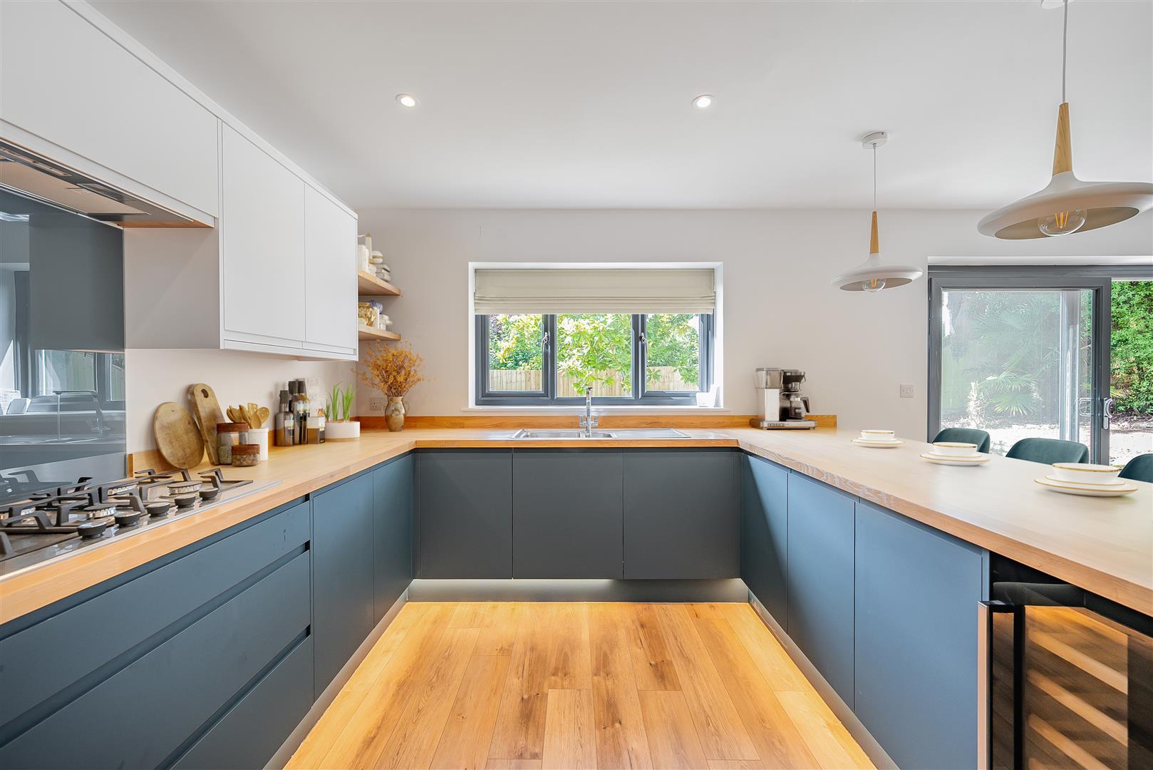 Adjacent to the kitchen, providing alternative side access via a clear glazed side door. Matching units and oak work surface alike to the kitchen, inset sink with drainer and mixer tap, and further under-counter space for washing machine and dryer. Worcester boiler providing domestic hot water and heating, ancillary fuse box. Radiator, inset downlights, continuation of quality wood-effect flooring.