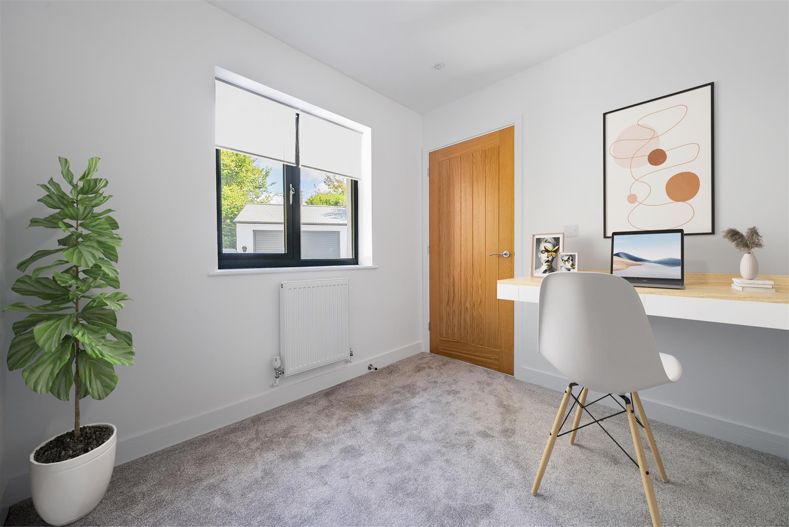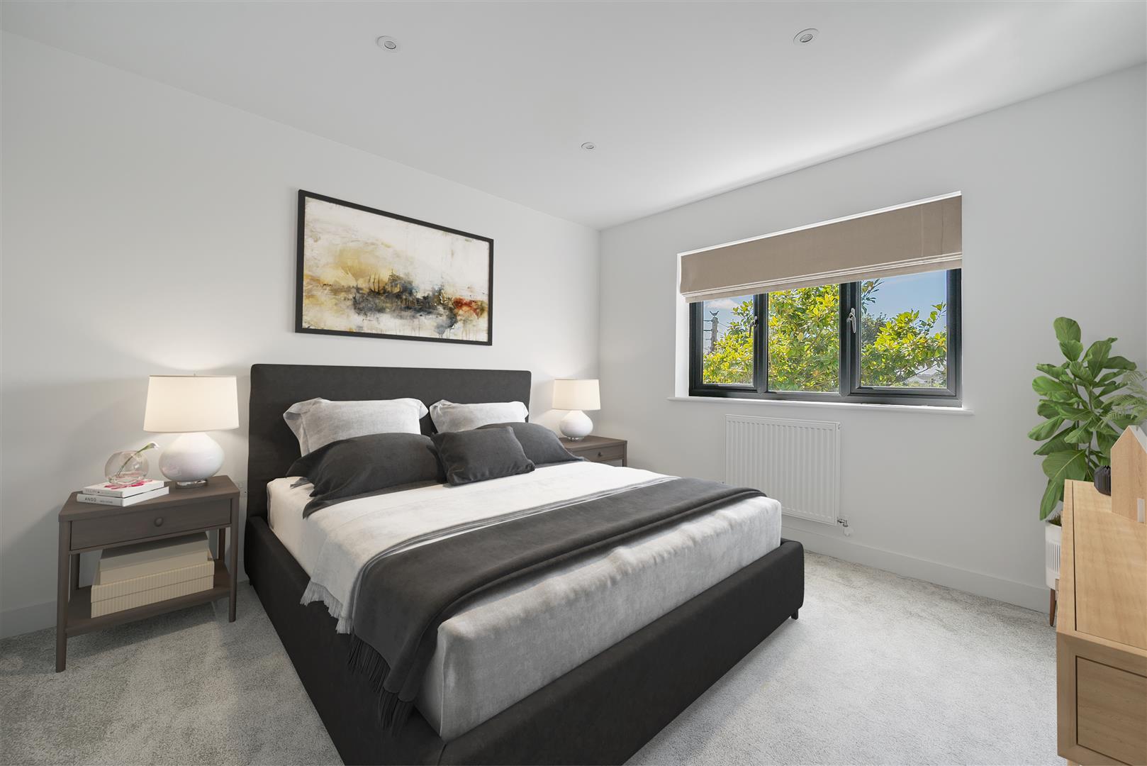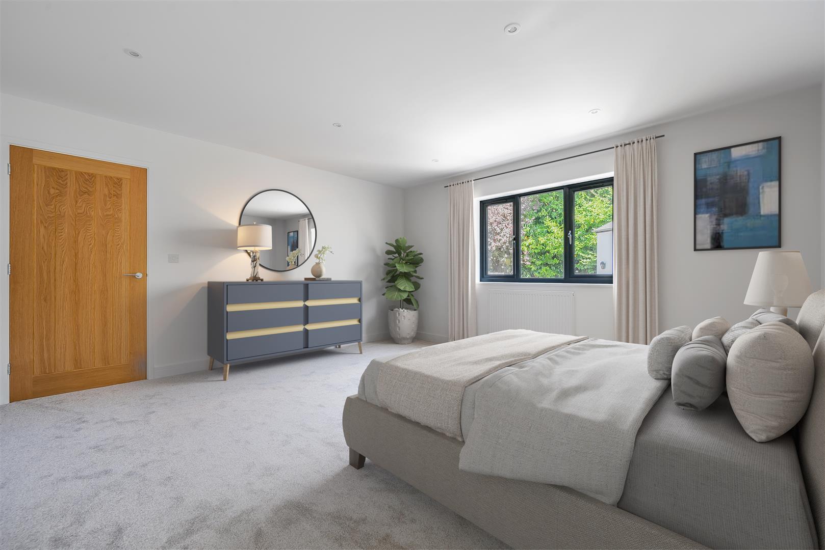 A nicely sized double room, square in shape, with broad uPVC casement window, radiator, inset downlights, and TV aerial point.
