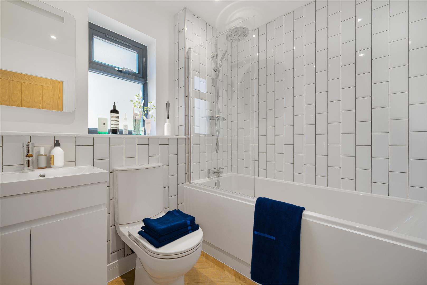 Low flush WC with concealed cistern, vanity unit with cupboard, sink, and tiled splashback. Obscure glazed window with deep sill. Heated towel rail, inset downlights, extractor fan. Continuation of quality wood-effect flooring.