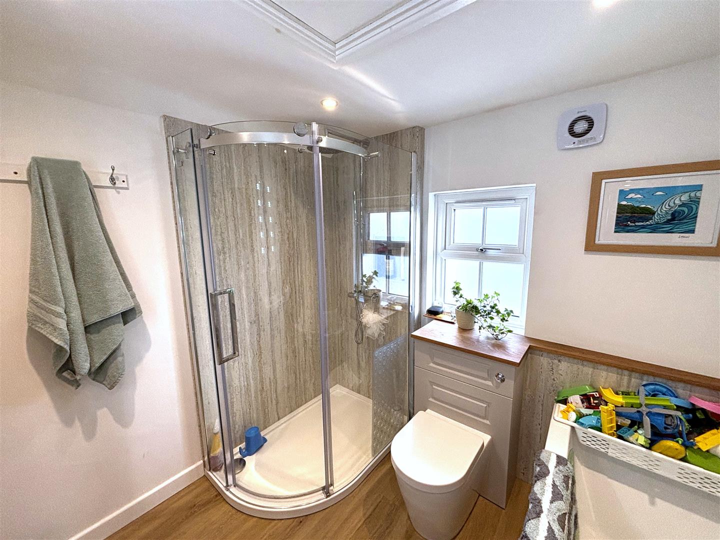 To the ground floor there is a large open plan kitchen/dining room with a feature island area with integrated appliances and patio door access out to the rear garden. There is also a large family living room spanning the length of the house with feature wood burning stove fireplace, a great family hallway space upon entry with plentiful storage and a modern ground floor shower room.